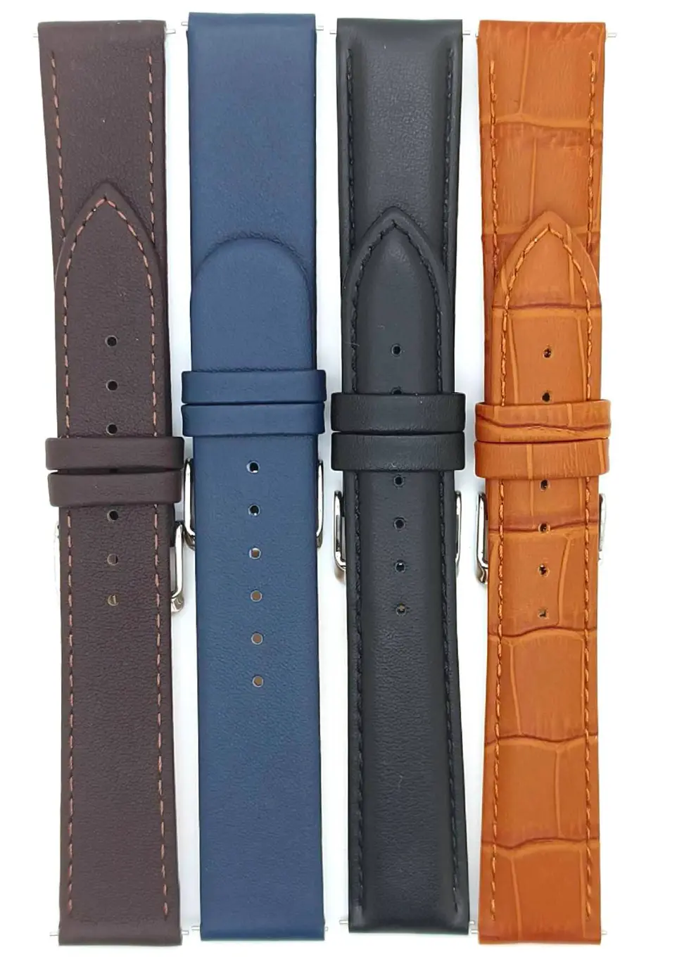 kalfsleren gevulde horlogeband voorzien van alligator print. Met stiksel en stalen gesp, voorzien van QR push-pins en in papieren doosje verpakt.